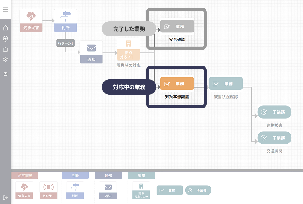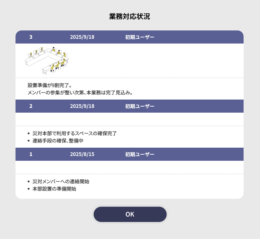 災害発生時などの緊急事態において、電話やメールで個別に状況を確認する必要はありません。各担当者がどの業務に着手しているか、対応状況がリアルタイムでシステム上に可視化されるため、現場の動きや進捗を即座に把握することができ、迅速な意思決定と的確な指示が可能になります。